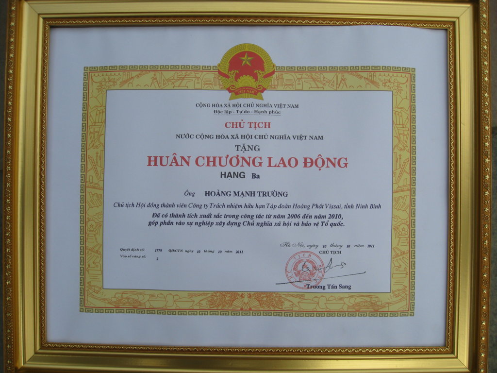 In the creative and enterprising labor spirit, one person for everyone’s sake to create more jobs, wealth and materials for the laborers, make contributions to the nation’s economy and socialist construction, the President of the Socialist Republic of Vietnam recognized credits and achievements of the Vissai and decide to award the third Class Labor Medal to Mr. Hoang Manh Truong